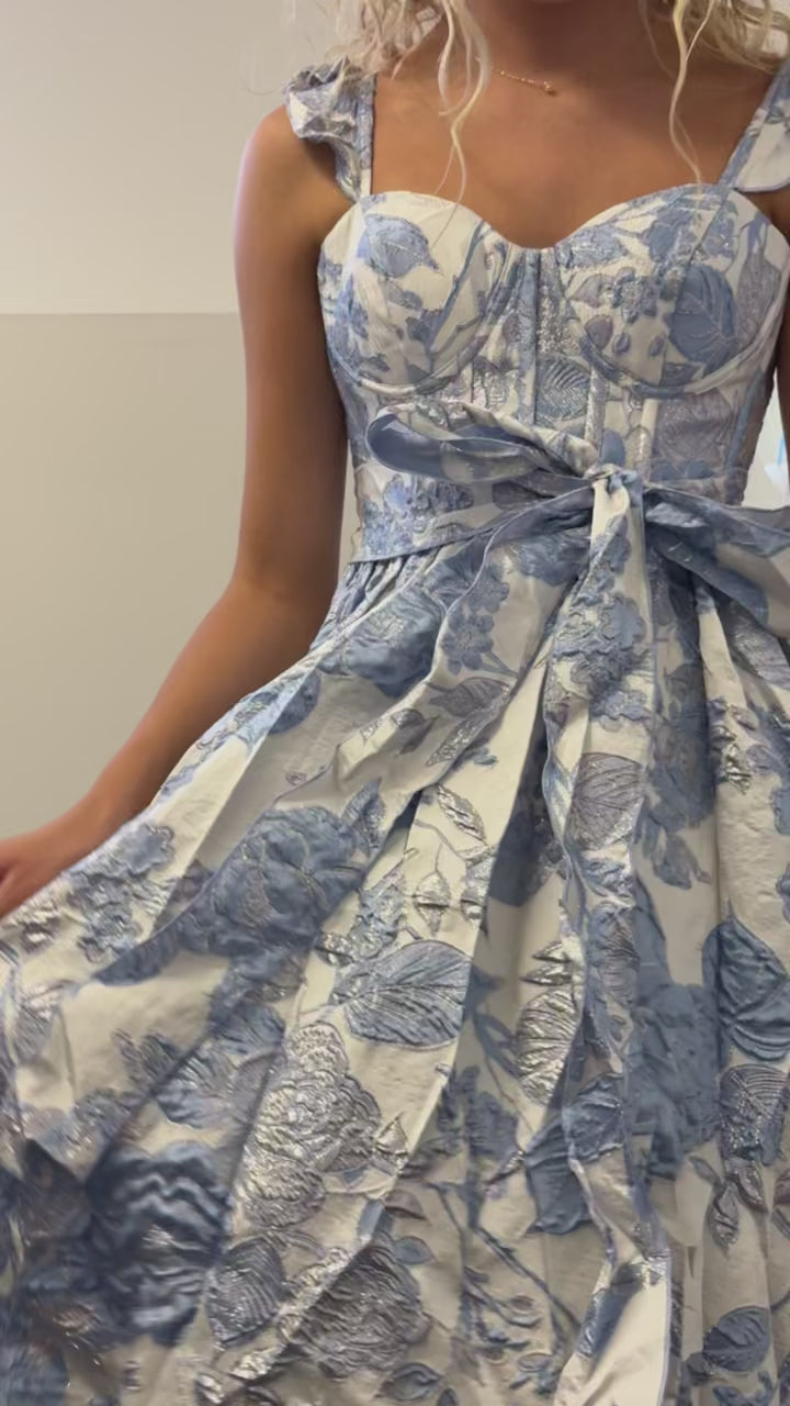 Flutter away in our newest arrival! This light blue brocade gown is a romantic, light blue floral print. It has the signature Ava Gowns bodice with exposed boning, flutter sleeves, bow tie for the waist, a side slit to the knee, and a gathered skirt with a ruffle bottom. The light blue foiled floral print is the perfect dress if you want a classic yet modern choice. Perfect for any bridal occasion or when you want to feel ultra feminine. 🩵💍